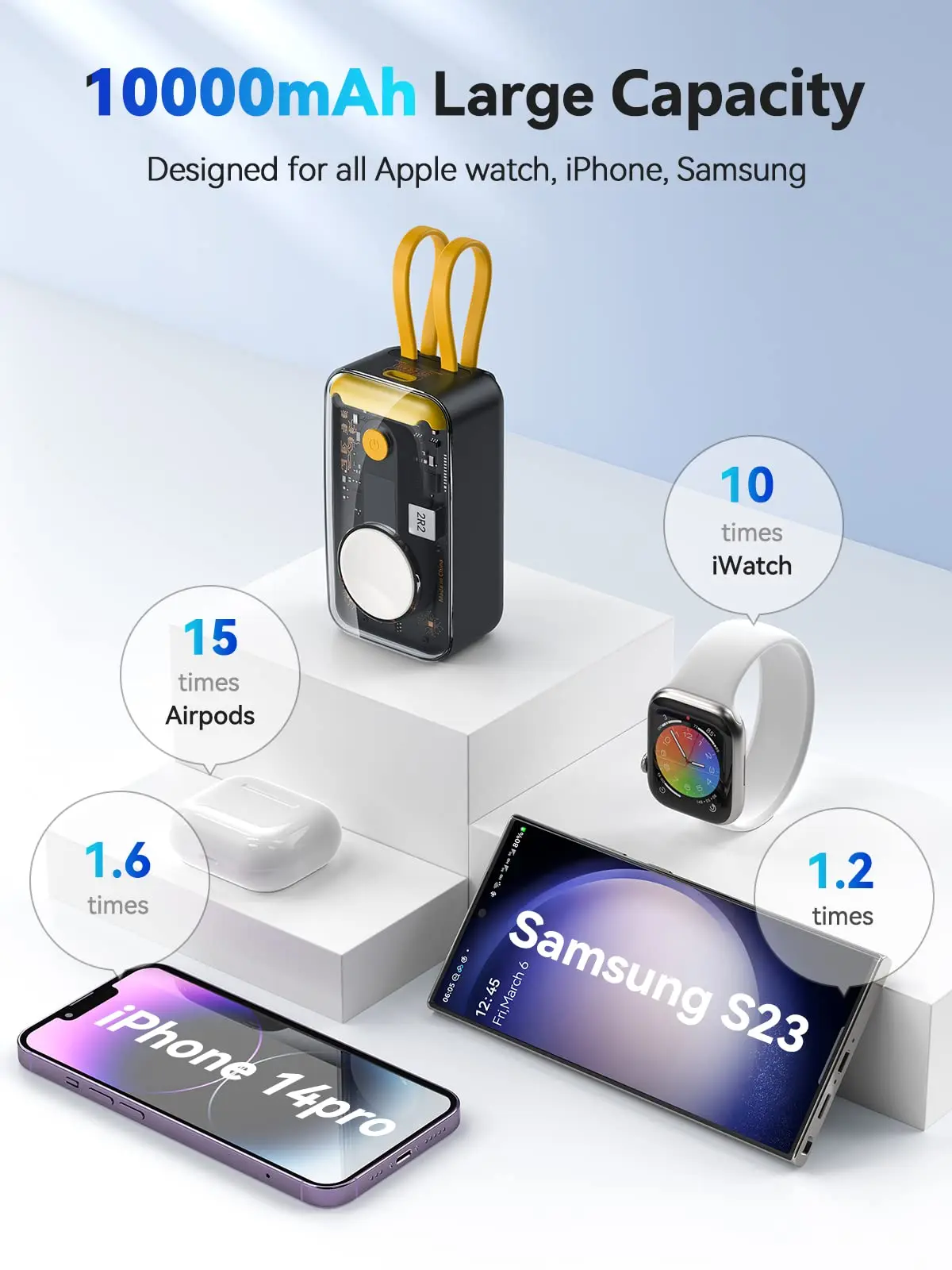 【Powerful Capacity】This portable charger for iPhone with a powerful capacity of 10000mAh, charges for Apple Watch about 10 times, for iPhone 14 pro about 1.6 times, S23 Ultra about 1.2 times, for Airpods would get about 15 charges, give you an excellent battery life experience.