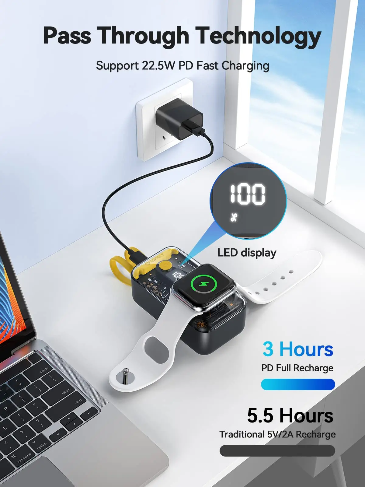 【 22.5W Fast Recharging】The iWatch charger with built-in a USB C port, supports up to 22.5W input and output, which can quickly charge your devices and save your charging time before traveling. It takes 3 hours to fully charge the portable phone charger through the 22.5 W USB C port.