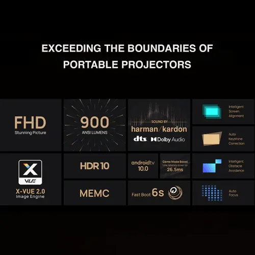 Experience movies, shows, and videos in stunning 1080p clarity with the XGIMI Halo+ Portable Projector. Boasting 900 ANSI Lumens of brightness and Harman Kardon speakers, you can watch anywhere you choose. Enjoy the convenience of Auto Focus and Keystone Correction for perfect picture setup, and enjoy Android TV 10.0 for an enhanced media streaming experience.
