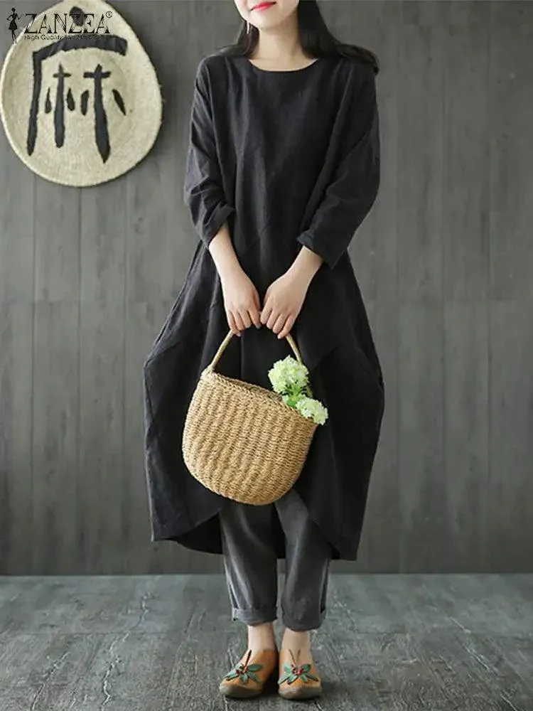 Features:Women Autumn Casual Vintage Cotton Linen Long Sleeve Asymmetrical Hem Dress